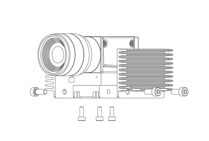 The camera holder with heat sink consists of three aluminum parts, which are fastened together by screw connections. The heat sinks side panels have milled ribs to maximize the cooling surface.