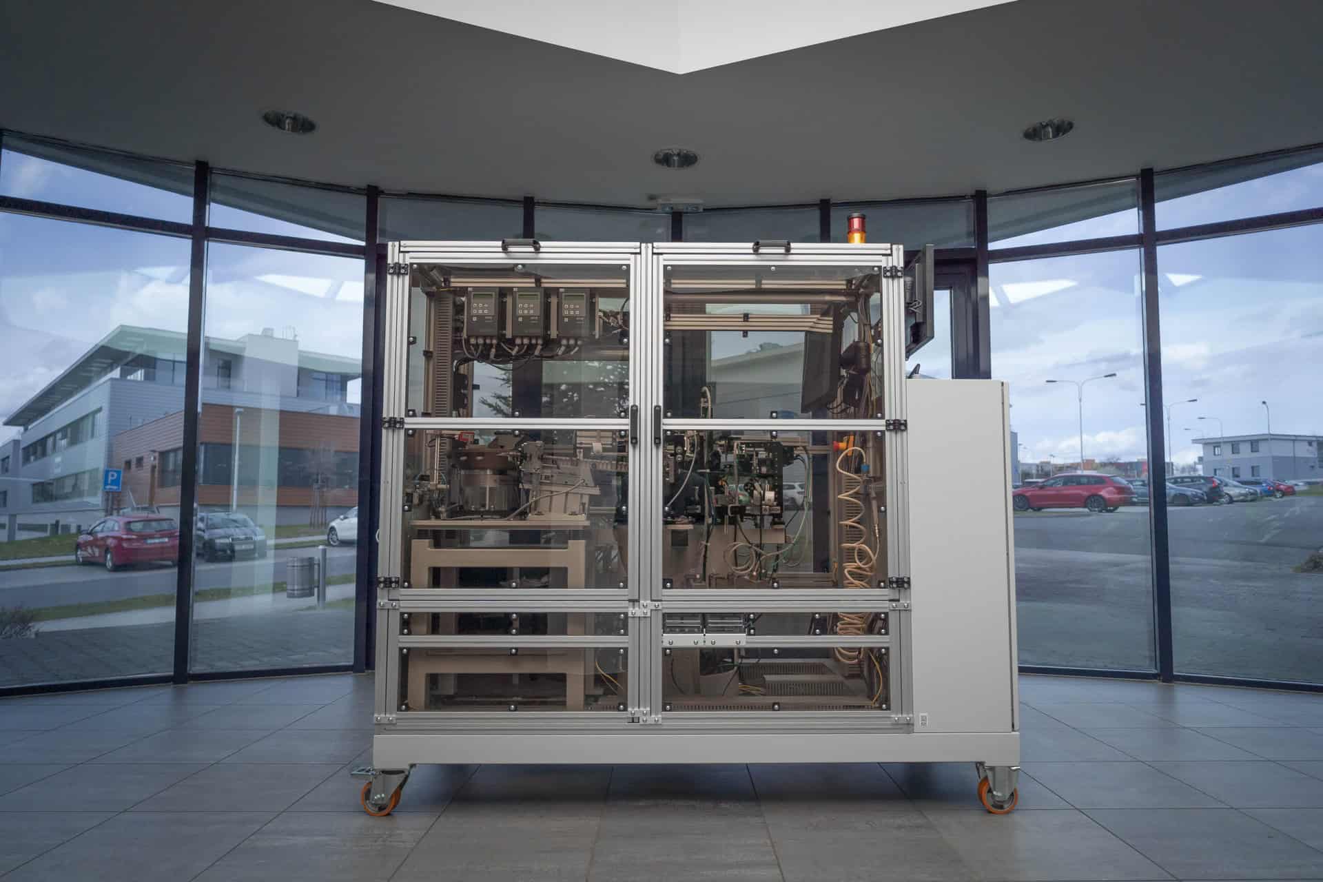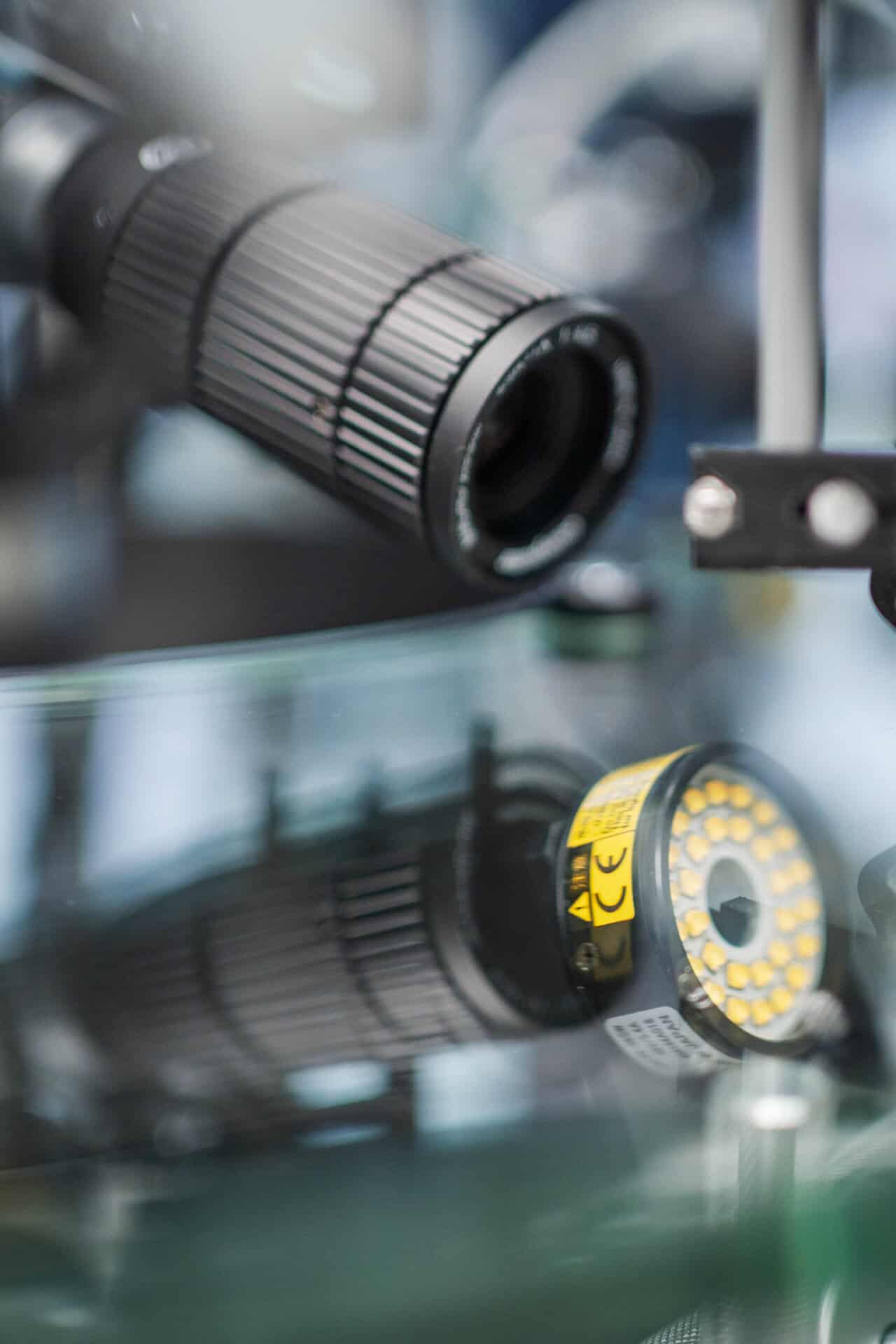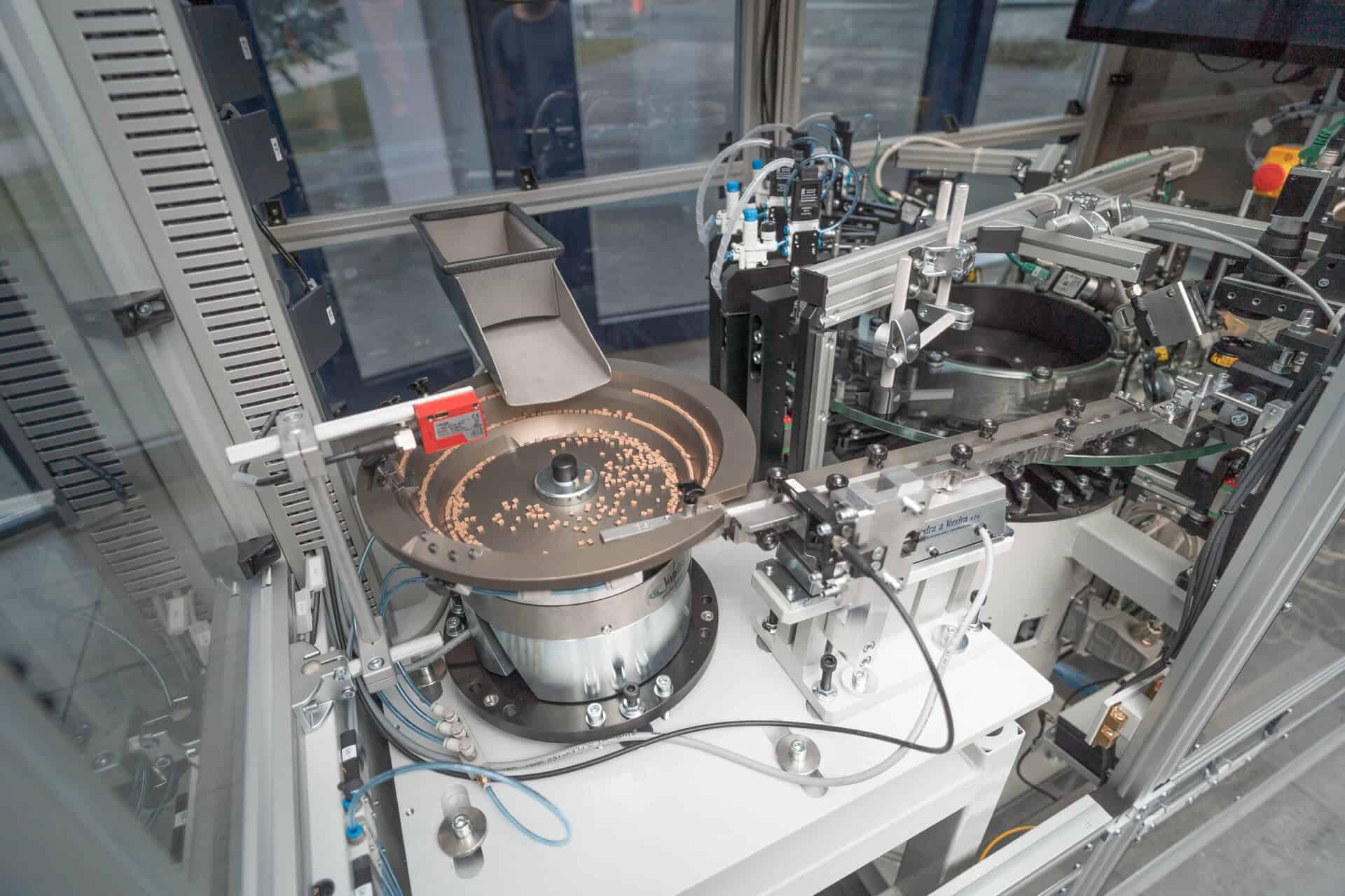 Srdcem stroje je rotační skleněný talíř s 12 pozicemi, na kterém jsou produkty postupně přiváděny pod jednotlivé kontrolní a třídící stanice. Díky vhodnému rozmístění kamer a osvětlení je možné kontrolovat součástky ze všech šesti stran a odhalit jak povrchové, tak i obtížně viditelné defekty. Kombinace klasického a polarizovaného světla umožňuje detekci i mikroskopických vad v povrchové úpravě nebo skrytých poruch v konstrukci součástek.